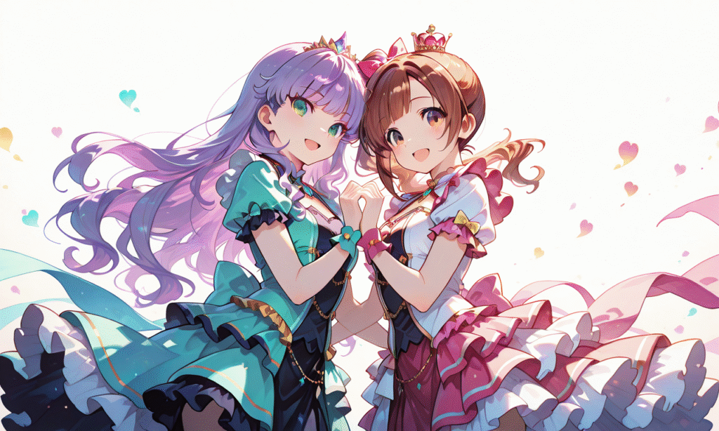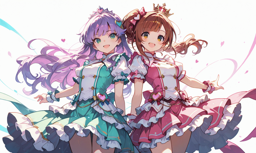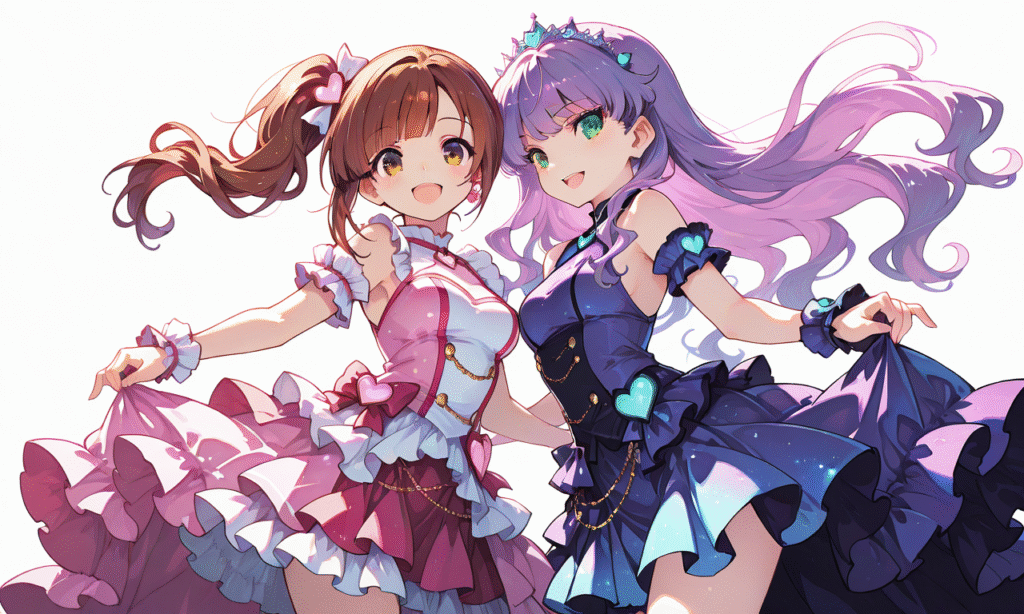 PixAI【Shiitake-Mix】2girls, Wien Margarete, green eyes, purple hair, Igarashi Kyoko, smile, open mouth, cowboy shot, simple background, white background, masterpiece, high quality, high resolution, radiant idol, center stage, dazzling spotlights, glittering pastel-colored dress, layered frills, short flared skirt, heart-shaped accessories, tokiame, hyper-detailed, high contrast, depth of field, ray tracing, best lighting, cinematic composition, beautiful face, beautiful eyes, sharp focus, (masterpiece:1.2), (best quality:1.2), (very aesthetic:1.2), (absurdres:1.2), detailed background, Fantasy Scene