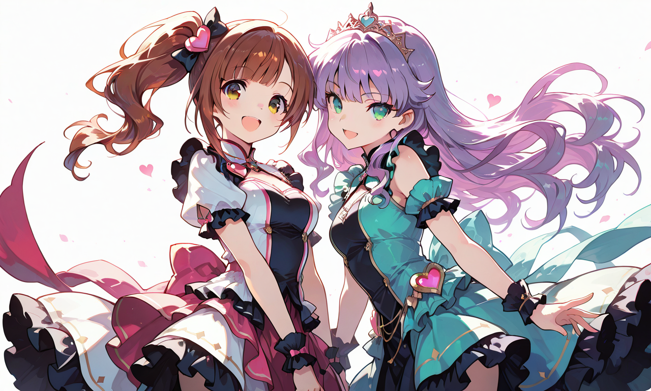 PixAI【Shiitake-Mix】2girls, Wien Margarete, green eyes, purple hair, Igarashi Kyoko, smile, open mouth, cowboy shot, simple background, white background, masterpiece, high quality, high resolution, radiant idol, center stage, dazzling spotlights, glittering pastel-colored dress, layered frills, short flared skirt, heart-shaped accessories, tokiame, hyper-detailed, high contrast, depth of field, ray tracing, best lighting, cinematic composition, beautiful face, beautiful eyes, sharp focus, (masterpiece:1.2), (best quality:1.2), (very aesthetic:1.2), (absurdres:1.2), detailed background, Fantasy Scene