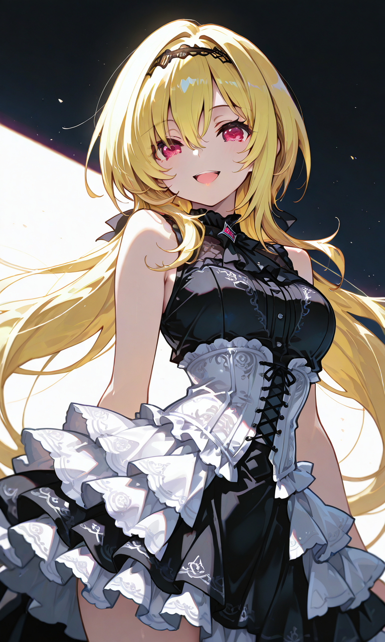 PixAI【Shiitake-Mix】kurosaki chitose, smile, open mouth, cowboy shot, gothic-style idol outfit featuring a white lace corset with silver embroidery, sleeveless, layered tulle skirt in deep burgundy and midnight blue, simple background, white background, masterpiece, high quality, high resolution, tokiame, hyper-detailed, high contrast, depth of field, ray tracing, best lighting, cinematic composition, beautiful face, beautiful eyes, sharp focus, (masterpiece:1.2), (best quality:1.2), (very aesthetic:1.2), (absurdres:1.2), (detailed background)