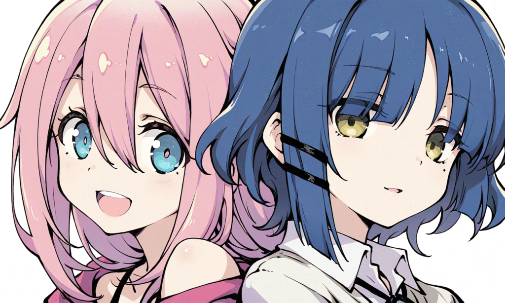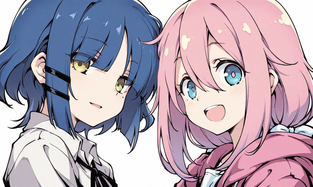 PixAI【Shiitake-Mix】2girls, yamada ryo, kagamihara nadeshiko, smile, open mouth, upper body, looking at viewer, shoulder-to-shoulder, simple background, white background, masterpiece, high quality, high resolution, tokiame, NineV