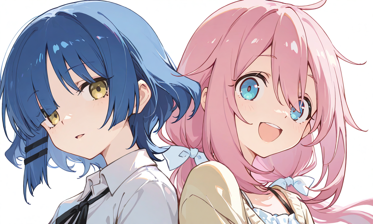 PixAI【Shiitake-Mix】2girls, yamada ryo, kagamihara nadeshiko, smile, open mouth, upper body, looking at viewer, shoulder-to-shoulder, simple background, white background, masterpiece, high quality, high resolution, tokiame, NineV
