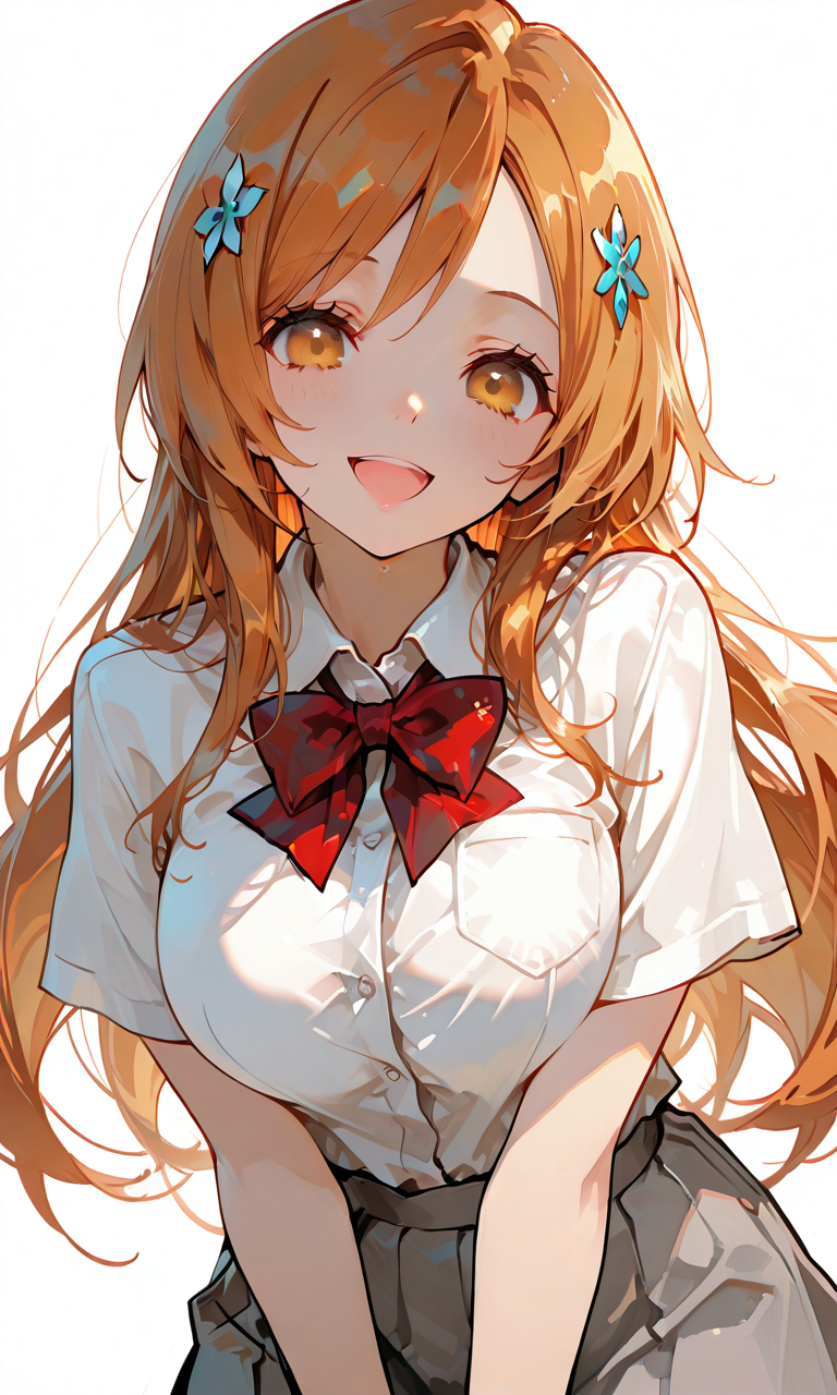 PixAI【Shiitake-Mix】inoue orihime,dress shirt, short sleeves, red bowtie, gray skirt,smile,open mouth, cowboy shot,simplebackground,white background, masterpiece,high quality, high resolution,hyper-detailed, high contrast, depth of field, ray tracing, best lighting, cinematic composition, beautiful face, beautiful eyes, sharp focus, (masterpiece:1.2), (best quality:1.2), (very aesthetic:1.2), (absurdres:1.2), (detailed background),tokiame,hyper-detailed, high contrast, depth of field, ray tracing, best lighting, cinematic composition, beautiful face, beautiful eyes, sharp focus, (masterpiece:1.2), (best quality:1.2), (very aesthetic:1.2), (absurdres:1.2), (detailed background),748cmstyle