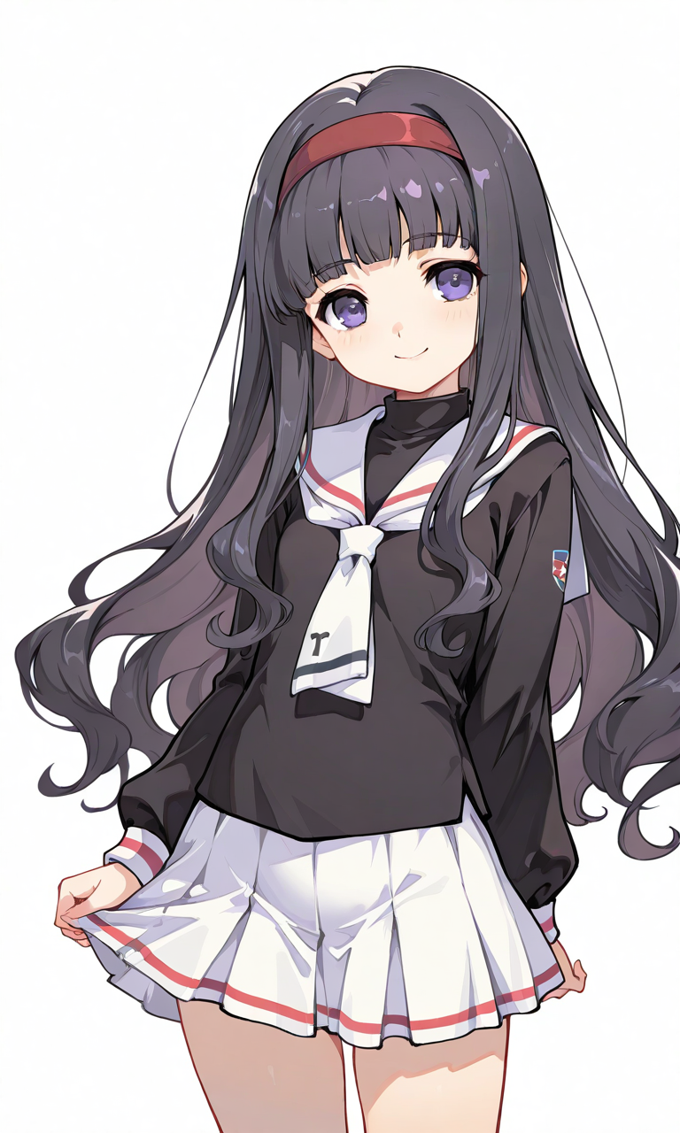 PixAI【Shiitake-Mix】daidouji tomoyo,loli,solo,red hairband, white miniskirt, smile,cowboy shot,simplebackground,white background, masterpiece,high quality, high resolution,tokiame