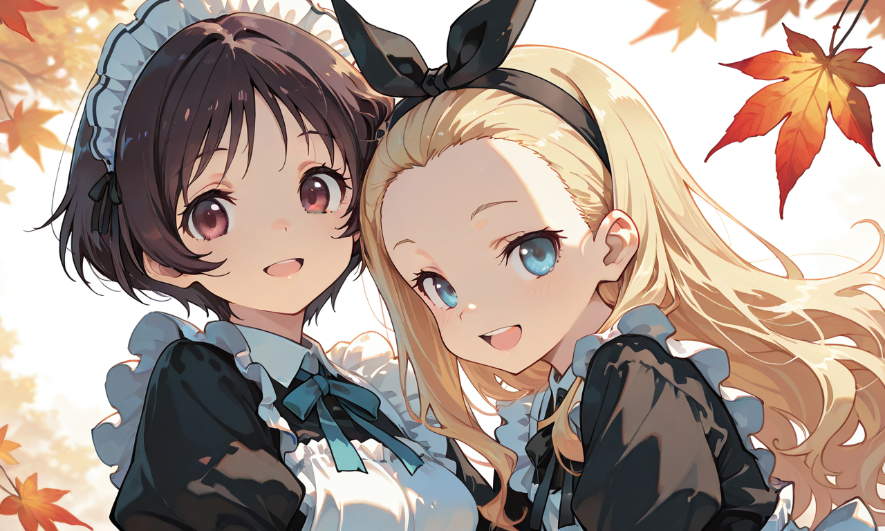PixAI【Shiitake-Mix】2girls,kurumi (lycoris recoil,hairribbon),tsuyuri kumin,smile,open mouth, maid, white thighhighs, shoulder-to-shoulder,looking at viewer,autumn, upper body, simplebackground,white background, masterpiece,high quality, ,tokiame,hyper-detailed, high contrast, depth of field, ray tracing, best lighting, cinematic composition, beautiful face, beautiful eyes, sharp focus, (masterpiece:1.2), (best quality:1.2), (very aesthetic:1.2), (absurdres:1.2), (detailed background),