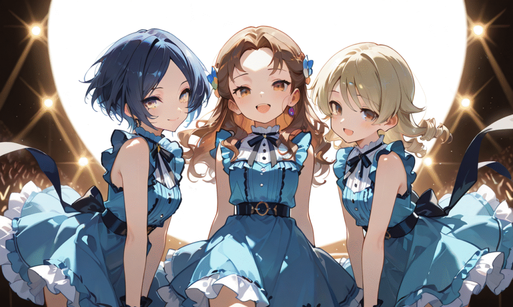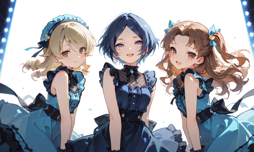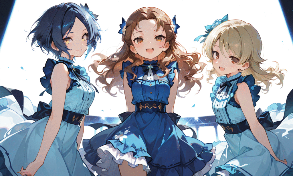 PixAI【Shiitake-Mix】3girls,hayami kanade(tall female), morikubo nono, seki hiromi,looking at viewer,shoulder-to-shoulder,singing, frilled dress, sleeveless, smile,open mouth, cowboy shot, simplebackground,white background, stage,masterpiece,high quality, high resolution,tokiame,hyper-detailed, high contrast, depth of field, ray tracing, best lighting, cinematic composition, beautiful face, beautiful eyes, sharp focus, (masterpiece:1.2), (best quality:1.2), (very aesthetic:1.2), (absurdres:1.2), (detailed background),NineV,Kawaii Precious XL