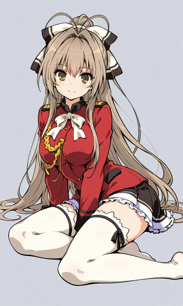 PixAI【Shiitake-Mix】sento isuzu(amagi brilliant park),white thighhighs, smile,yokozuwari, full body, simplebackground,white background, masterpiece,high quality, high resolution,tokiame