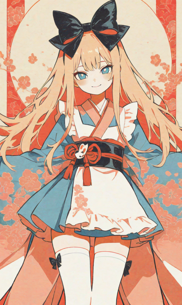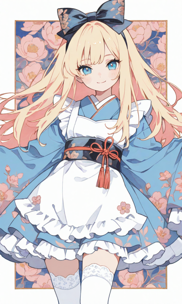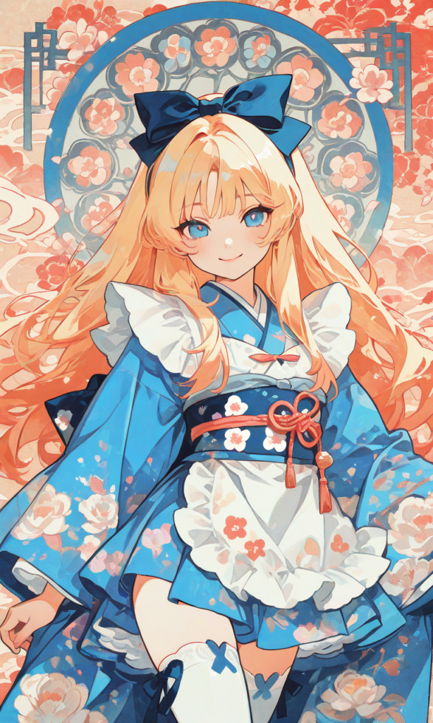 ((ukiyo-e)),alice (alice in wonderland), loli,solo,kimono, looking at viewer, smile, white thighhighs, cowboy shot,cowboy shot,Japanese pattern background,minimalism, masterpiece,high resolution,high quality,
