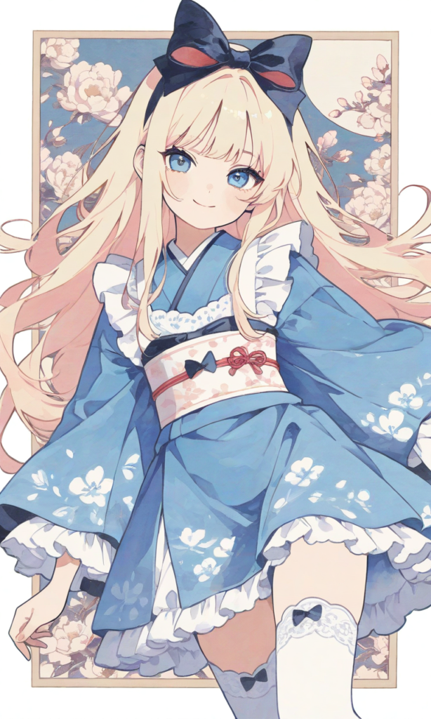 PixAI【Shiitake-Mix】((ukiyo-e)),alice (alice in wonderland), loli,solo,Blue kimono, looking at viewer, smile, white thighhighs, cowboy shot,cowboy shot,Japanese pattern background,minimalism, masterpiece,high resolution,high quality,