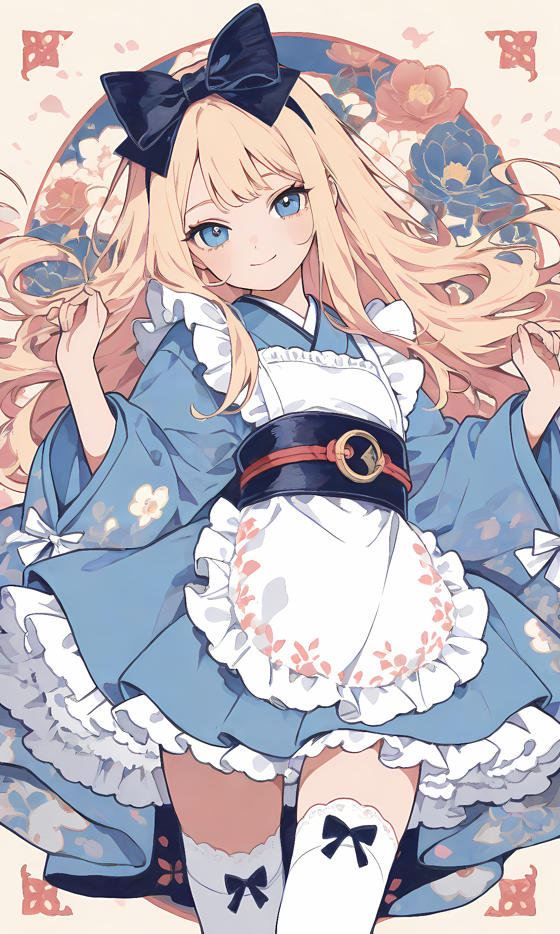 ((ukiyo-e)),alice (alice in wonderland), loli,solo,kimono, looking at viewer, smile, white thighhighs, cowboy shot,cowboy shot,Japanese pattern background,minimalism, masterpiece,high resolution,high quality,