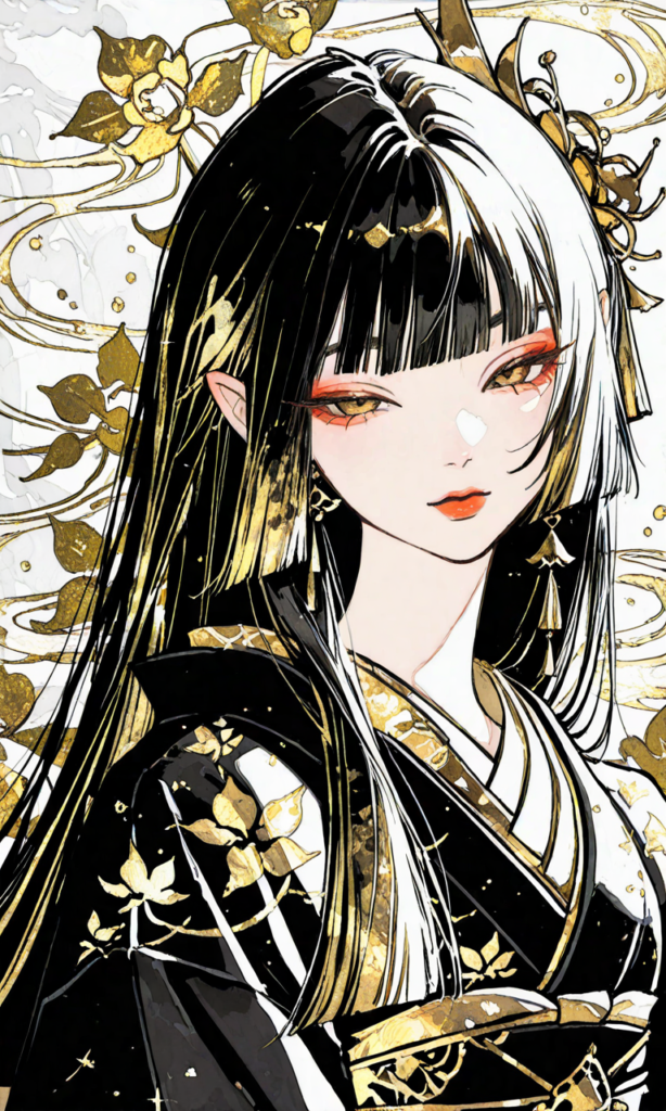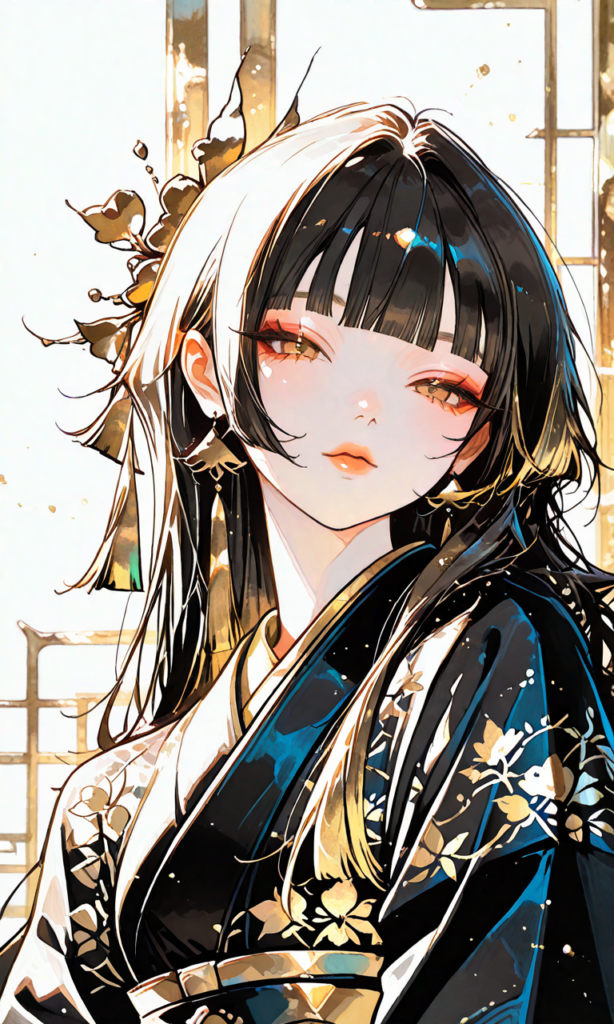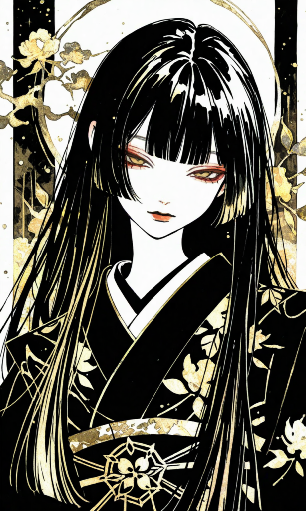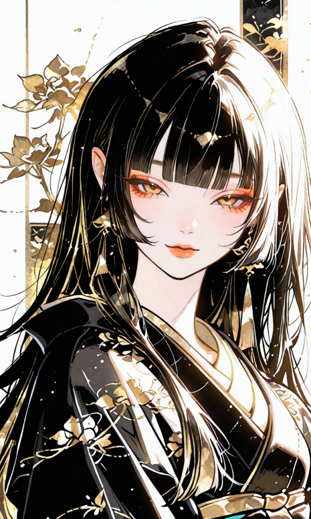 PixAI【Haruka v2】nihonga, 1girl,gold theme,Black kimono,gold flower print,looking at viewer, black hair, long hair, straight hair, blunt bangs,narrowed eyes,upper body, Japanese pattern gold background,minimalism,overwhelmingly gold dominant color palette, intricate embossed gold patterns of cranes,regal and opulent atmosphere, dramatic golden rim lighting and god rays, black void background with faint golden sparkles and particles, highly detailed metallic textures, gold leaf art influence,masterpiece,high resolution,high quality, high resolution,high-res,white background, sketch, messy lines, faded lines, sketchy,Shiguretau, ((nihonga, japanese aesthetic, detailed ink work, brushworks, brush strokes, flowing lines, analog painting)), vivid color, high contrast, highly detailed and intricate patterns dress and background, precise lines, color gradients,((sketch-like_outlines, watercolor_coloring, watercolor_texture, japanese_style, best_quality, ultra_detailed, lineart-heavy_style, sketch_style)),♡masterpiece, highest quality, ♡,hyper-detailed, high contrast, depth of field, ray tracing, best lighting, cinematic composition, beautiful face, beautiful eyes, sharp focus, (masterpiece:1.2), (best quality:1.2), (very aesthetic:1.2), (absurdres:1.2), (detailed background),