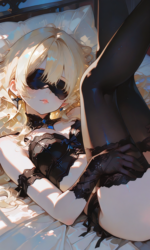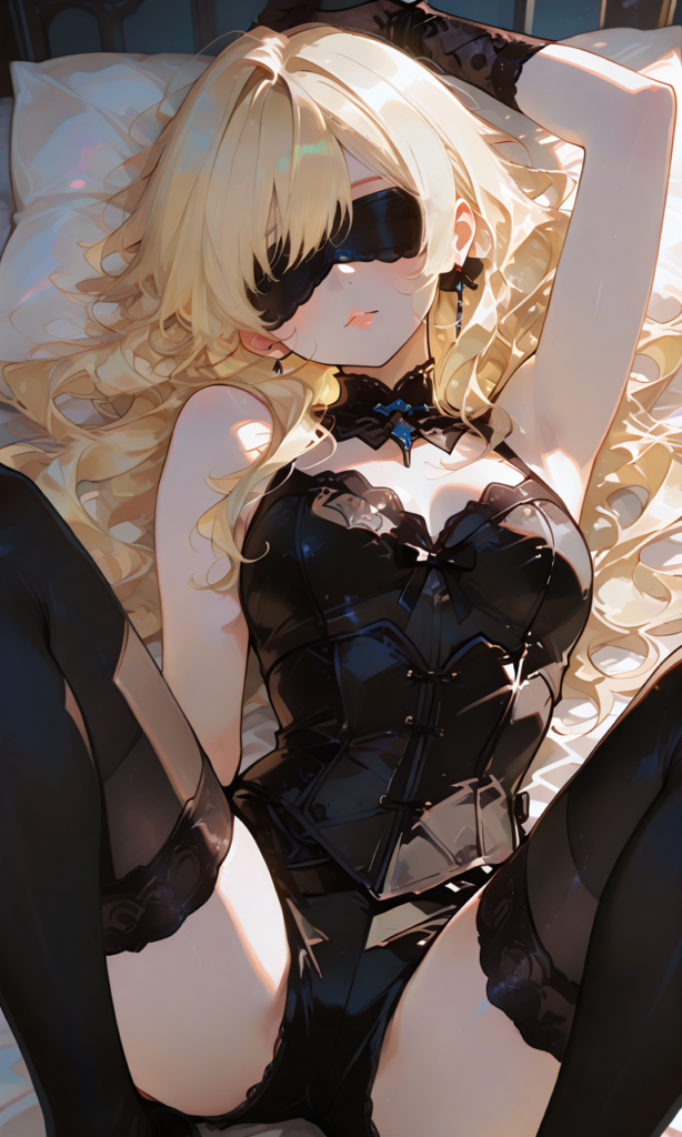 PixAI【Shiitake-Mix】girl,blonde hair, wavy hair, black bustier,black thighhighs, lace gloves,blindfold,sitting, bed,simple background, masterpiece,high resolution,high quality, ,high-res,♡masterpiece, highest quality, ♡,748cmstyle,hyper-detailed, high contrast, depth of field, ray tracing, best lighting, cinematic composition, beautiful face, beautiful eyes, sharp focus, (masterpiece:1.2), (best quality:1.2), (very aesthetic:1.2), (absurdres:1.2), (detailed background),