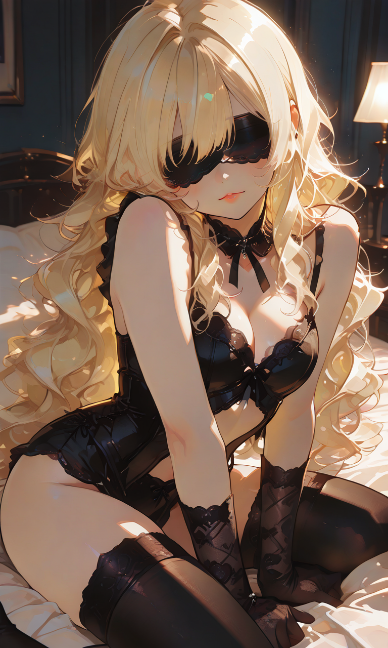 PixAI【Shiitake-Mix】girl,blonde hair, wavy hair, black bustier,black thighhighs, lace gloves,blindfold,sitting, bed,simple background, masterpiece,high resolution,high quality, ,high-res,♡masterpiece, highest quality, ♡,748cmstyle,hyper-detailed, high contrast, depth of field, ray tracing, best lighting, cinematic composition, beautiful face, beautiful eyes, sharp focus, (masterpiece:1.2), (best quality:1.2), (very aesthetic:1.2), (absurdres:1.2), (detailed background),