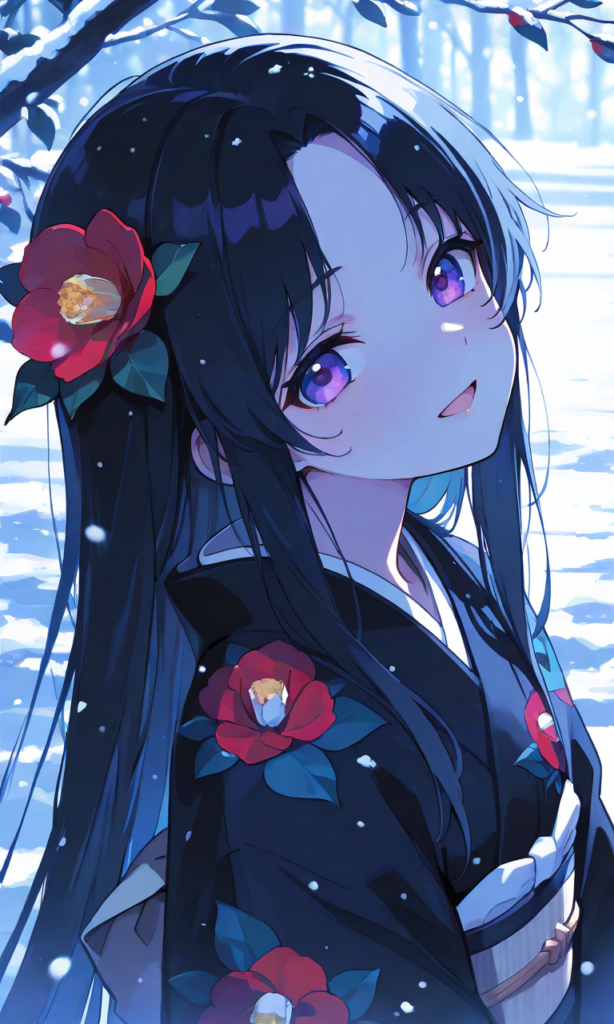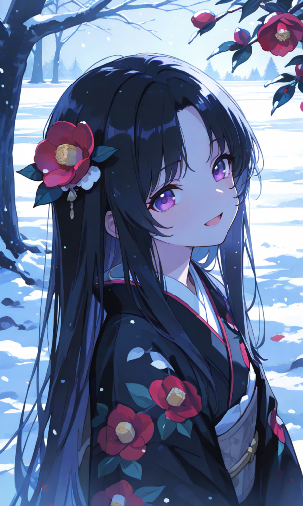 PixAI【Shiitake-Mix】(flat design, anime coloring, vivid:1.5),Camellia trees,alpenglow,snowing, little girl,black hair, long hair, parted bangs,straight hair, purple eyes, tareme,camellia hair ornament, black kimono,smile,open mouth, upper body, masterpiece,high quality,camellia print kimono,black kimono,look up Camellia tree,((from above)),winter,outdoor,looking at viewer, high-res,748cmstyle,cinematic lighting , cinematic angle, soft light , color detail, backlighting, Depth of field, long exposure, light steps, intricate colors, vibrant colors,