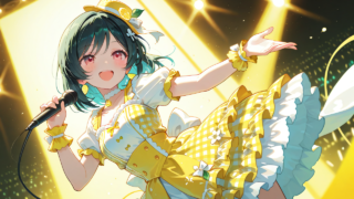 PixAI【Shiitake-Mix】lovelive, mifune shioriko, 1girl, cheerful, idol, lemon-inspired costume, yellow and white gingham d...