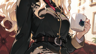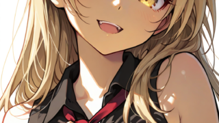PixAI【Shiitake-Mix】matsunaga ryo,black dress shirt,sleeveless,red necktie,holding necktie,yellow eyes, smile,open mouth...