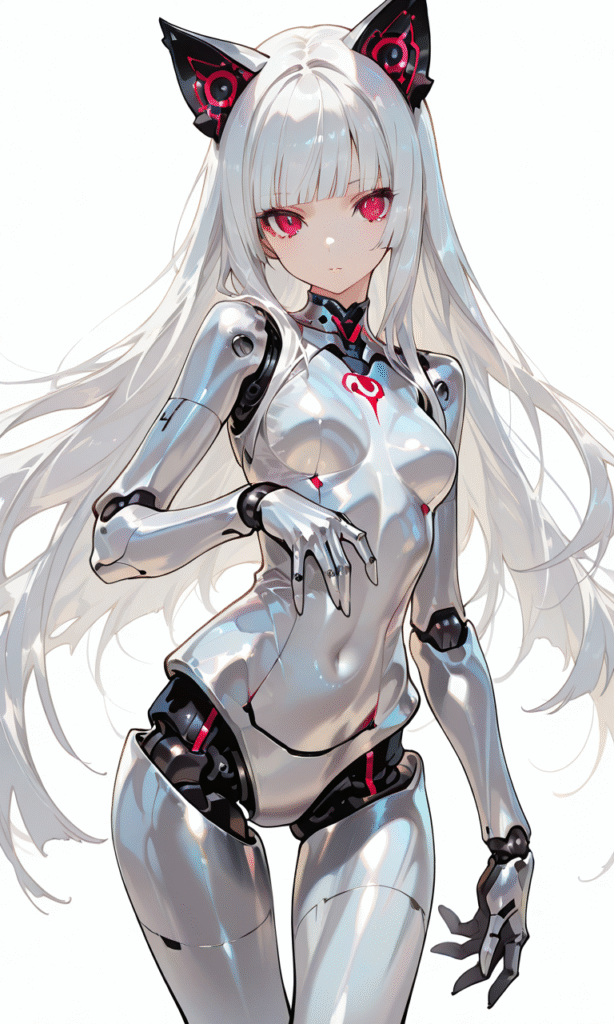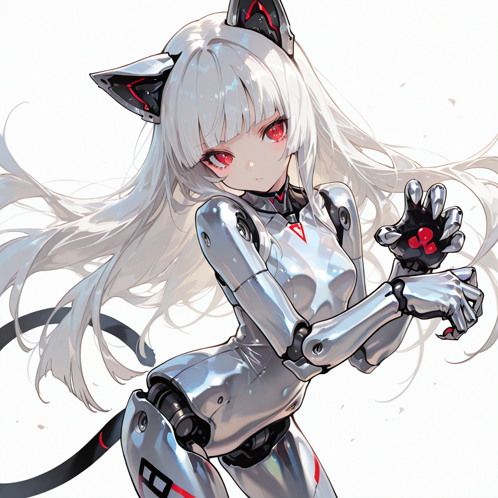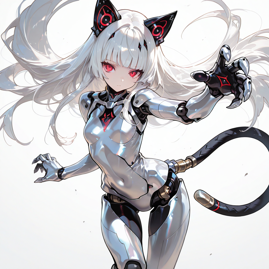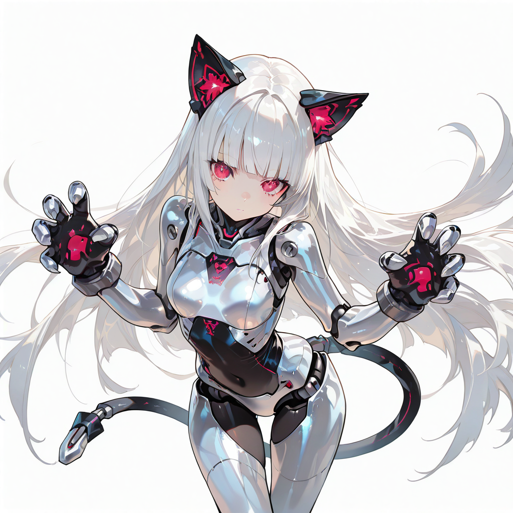 PixAI【Shiitake-Mix】1girl, robot girl, doll joints, cat ears, mechanical tail, silver hair, long hair, straight hair, blunt bangs, red eyes, big cat hands, looking at viewer, mechanical hands, mechanical arms, mechanical legs, silver metal body, dynamic pose, cowboy shot, simple background, white background, masterpiece, high quality, high resolution, tokiame, hyper-detailed, high contrast, depth of field, ray tracing, best lighting, cinematic composition, beautiful face, beautiful eyes, sharp focus, (masterpiece:1.2), (best quality:1.2), (very aesthetic:1.2), (absurdres:1.2), (detailed background), shiny skin, shiny