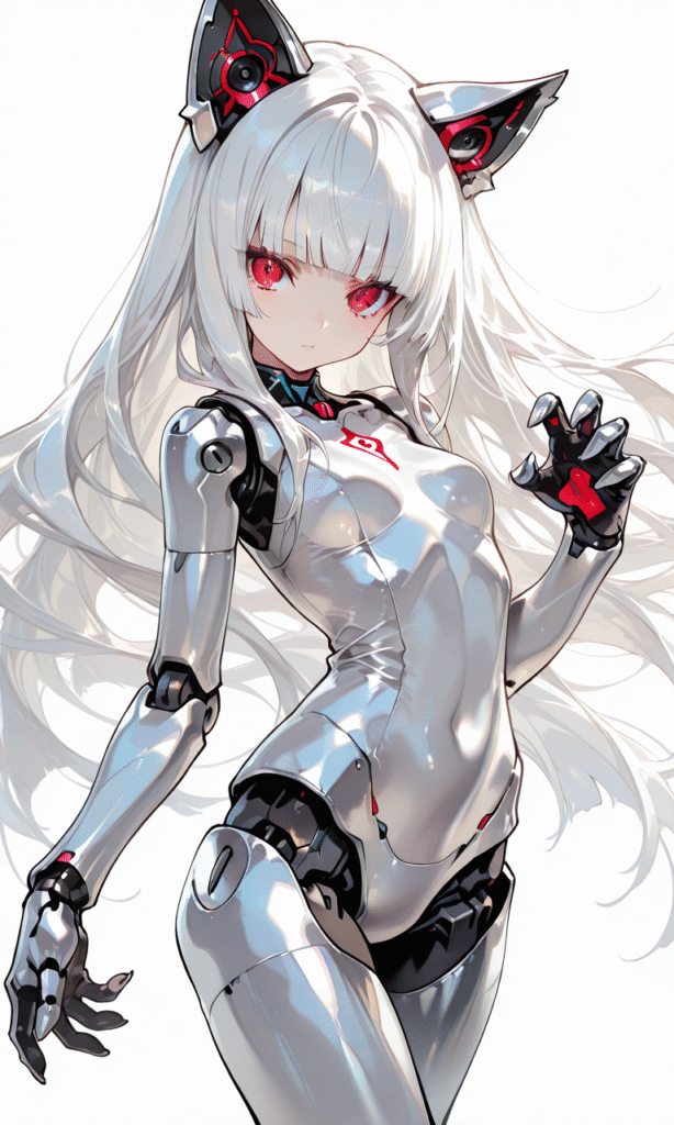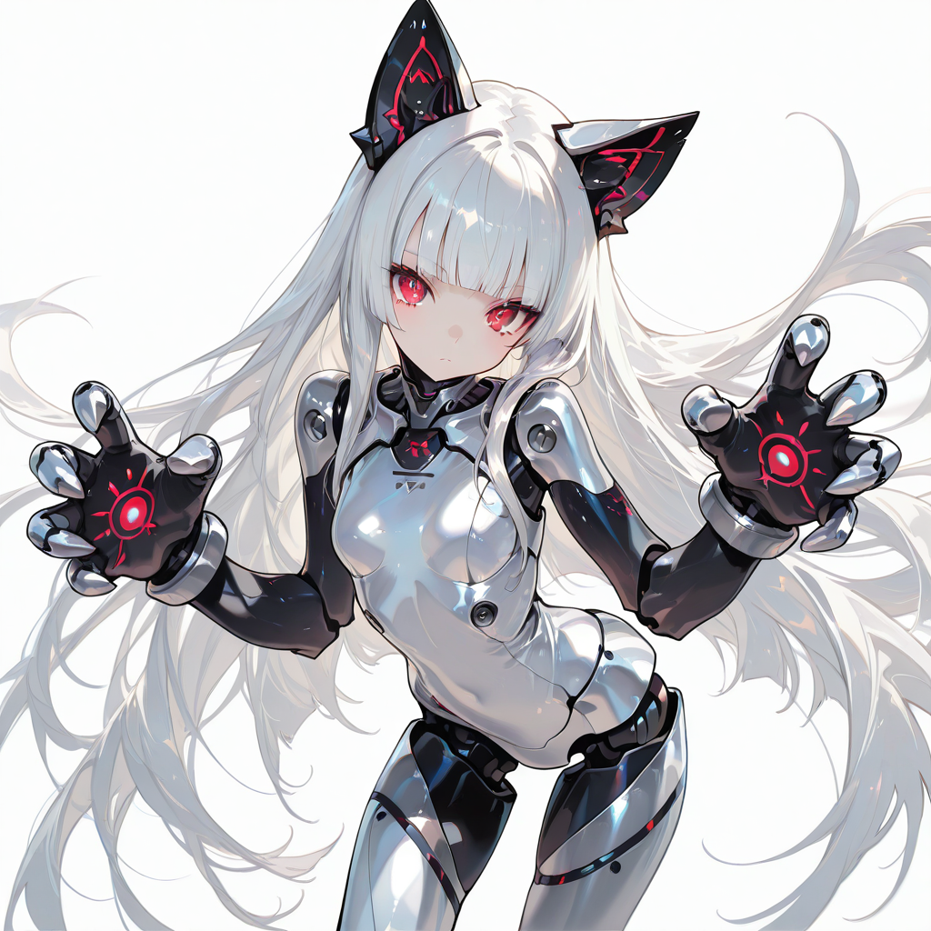 1girl, robot girl, doll joints, cat ears, silver hair, long hair, straight hair, blunt bangs, red eyes, big cat hands, looking at viewer, mechanical hands, mechanical arms, mechanical legs, silver metal body, dynamic pose, cowboy shot, simple background, white background, masterpiece, high quality, high resolution, tokiame, hyper-detailed, high contrast, depth of field, ray tracing, best lighting, cinematic composition, beautiful face, beautiful eyes, sharp focus, (masterpiece:1.2), (best quality:1.2), (very aesthetic:1.2), (absurdres:1.2), (detailed background), shiny skin, shiny