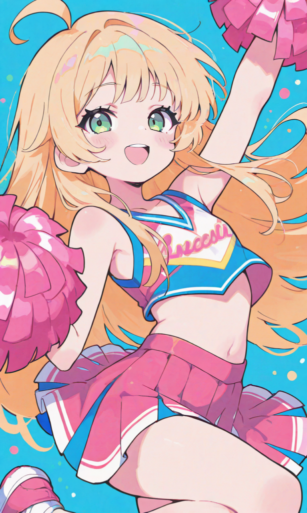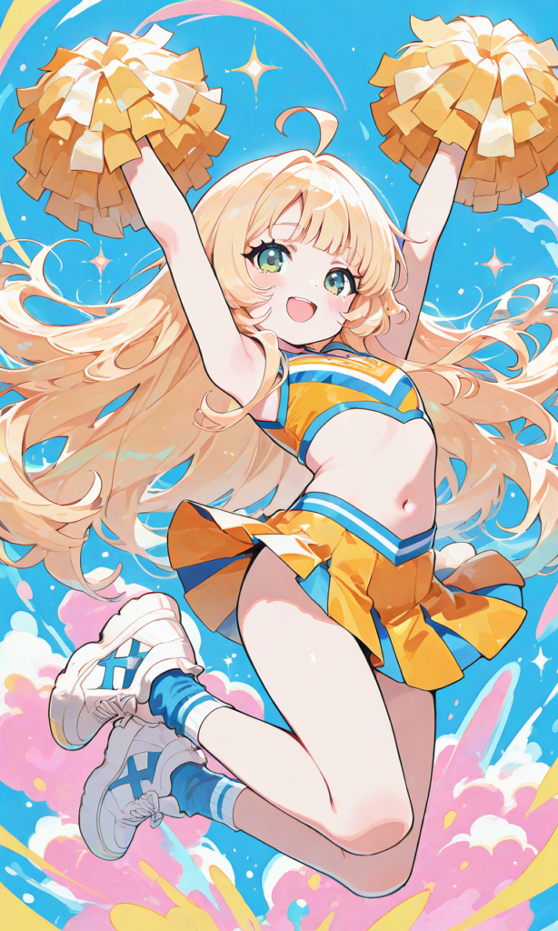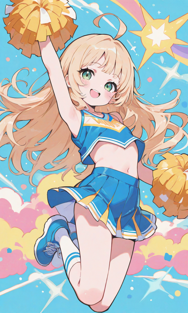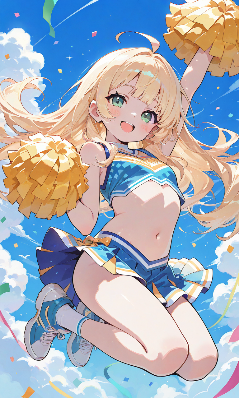 PixAI【Shiitake-Mix】flat color, cel shading, little girl,loli,solo, blonde hair, long hair, straight hair, ahoge, green eyes,cheerleader, smile,open mouth,arm up, jumping, full body,looking at viewer, stomach,blue sky, confetti, masterpiece,high quality, high resolution,high-res,neon pop art style,♡masterpiece, highest quality, ♡