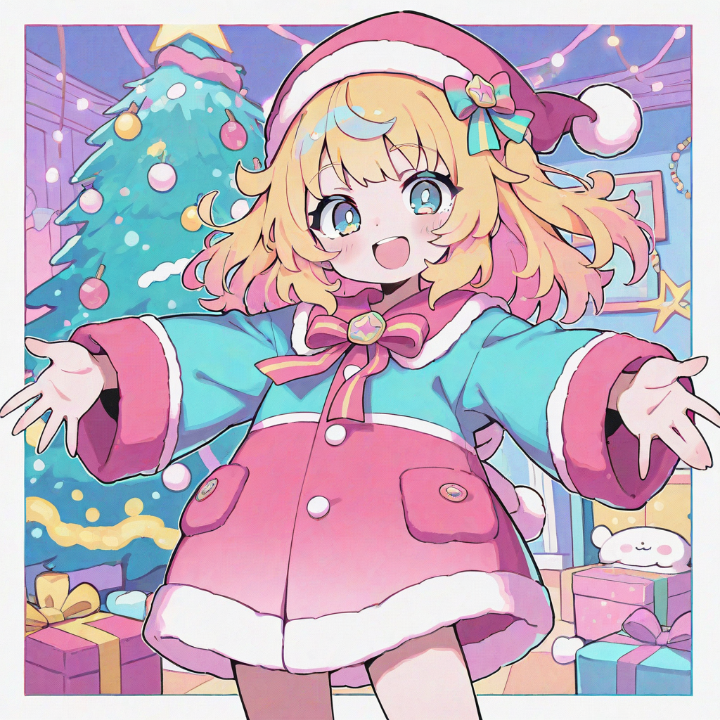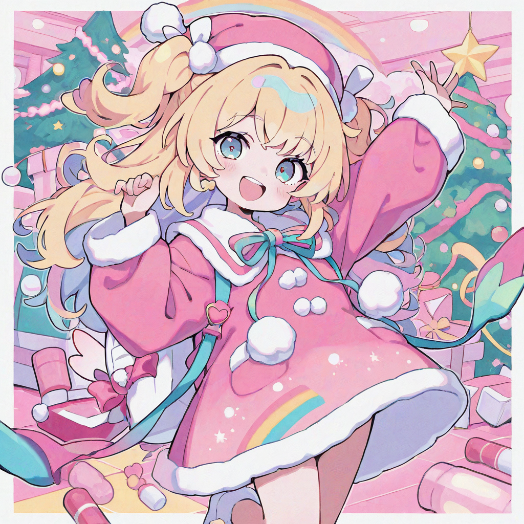 PixAI【Shiitake-Mix】little girl,blonde hair, smile,open mouth, cowboy shot,A pink Christmas tree in a child’s room filled with toys, marshmallow and candy ornaments, rainbow-colored tree lights, and colorful presents on the floor. So cute! Kawaii, vibrant colors, anime style, masterpiece,high quality, high resolution,high-res,White border, Ultra detailed, ,neon pop art style