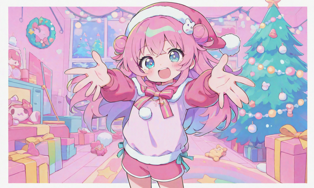 little girl,smile,open mouth, cowboy shot,A pink Christmas tree in a child’s room filled with toys, marshmallow and candy ornaments, rainbow-colored tree lights, and colorful presents on the floor. So cute! Kawaii, vibrant colors, anime style, masterpiece,high quality, high resolution,high-res,White border, Ultra detailed, ,neon pop art style