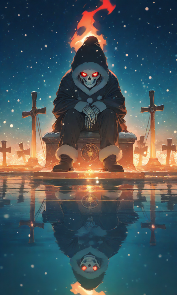 skeleton,((black santa costume)), sitting on gravestone,masterpiece,high resolution,high quality, Glowing red eyes,night sky, snowing, will-o’-the-wisp,character focus, depth of field, glowing particles, glowing, reflection, blue theme, red theme, green theme, orange theme, yellow theme