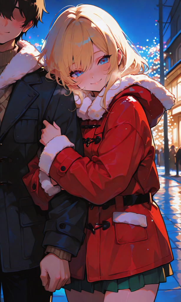 1girl, 1boy, winter clothes, cowboy shot, smile, another’s arm lock, christmas, night, masterpiece, high resolution, high quality, high-res, 748cmstyle, neon pop art style, hyper-detailed, high contrast, depth of field, ray tracing, best lighting, cinematic composition, beautiful face, beautiful eyes, sharp focus, (masterpiece:1.2), (best quality:1.2), (very aesthetic:1.2), (absurdres:1.2), (detailed background)