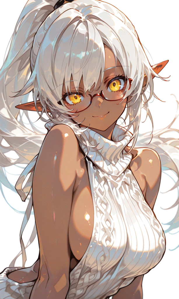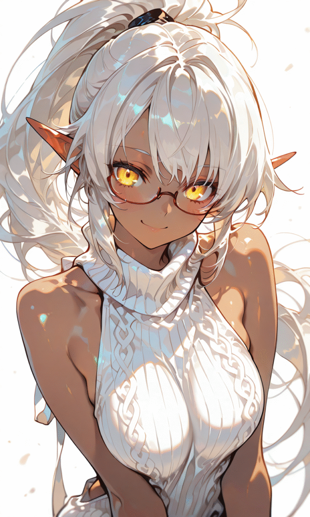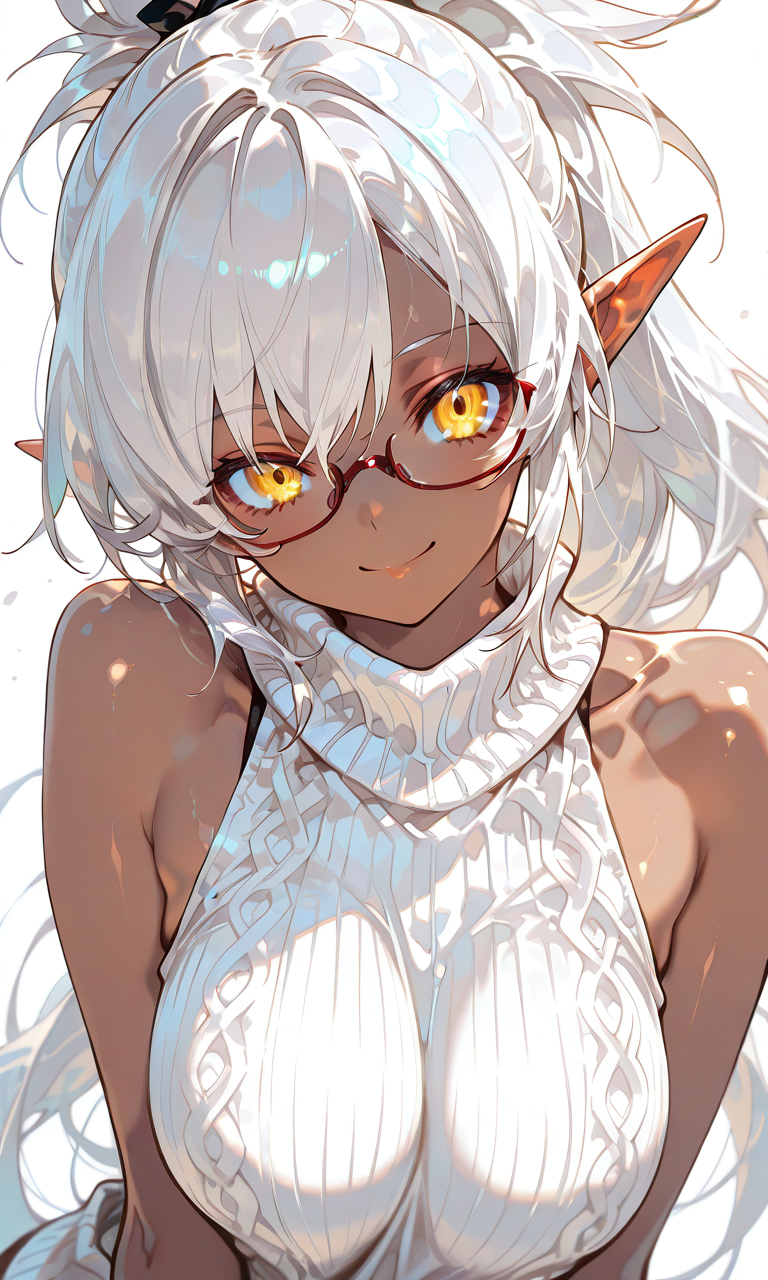 PixAI【Shiitake-Mix】girl,dark elf,silver hair, ponytail,virgin killer sweater,white sweater,looking at viewer, under-rim eyewear, yellow eyes,large breast, upper body, smile,simplebackground,white background, masterpiece,high quality, high resolution,hyper-detailed, high contrast, depth of field, ray tracing, best lighting, cinematic composition, beautiful face, beautiful eyes, sharp focus, (masterpiece:1.2), (best quality:1.2), (very aesthetic:1.2), (absurdres:1.2), (detailed background),tokiame, Fantasy Scene, ,shiny skin, shiny