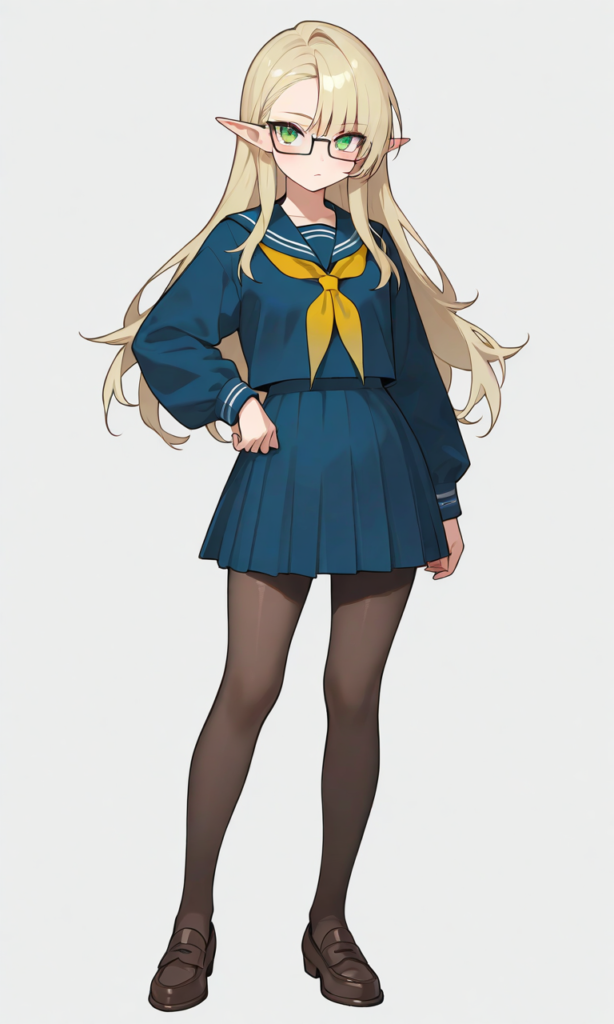 elf, girl,blonde hair, long hair, asymmetrical bangs, green eyes,rectangular eyewear, tsurime,Blue serafuku,yellow neckerchief, long sleeves,full body, gradient eyes, pantyhose,loafers,looking at viewer, standing, simple background,white background, masterpiece,high resolution,high quality, ,Simple coloring, limited color palette, grainy texture, color contrast, complementary colors, defined shading,high-res,