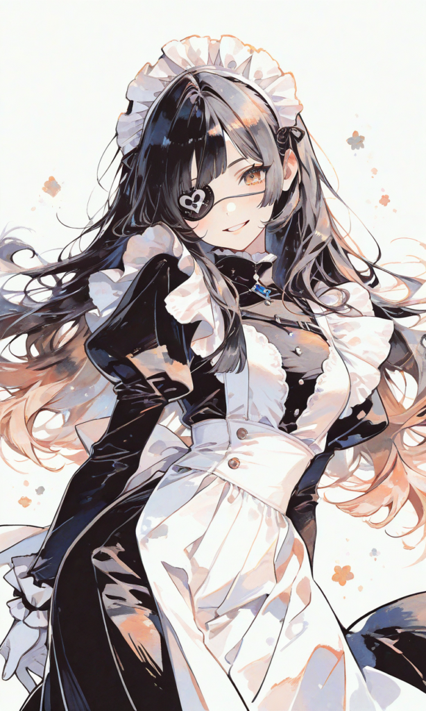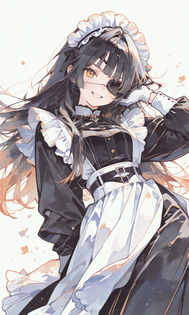 PixAI【Shiitake-Mix】1girl,black hair, long hair, ((straight hair)), ((Eye patch)),grin, maid, maid headdress,long sleeves, long skirt, white gloves, cowboy shot,simple background, masterpiece,high resolution,high quality, ,♡masterpiece, highest quality, ♡,high-res,Simple coloring, limited color palette, grainy texture, color contrast, complementary colors, defined shading,(watercolor_(medium):1.2)(simple coloring,flat color:2)dutch angle