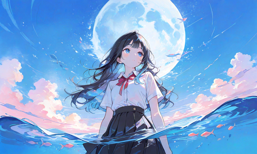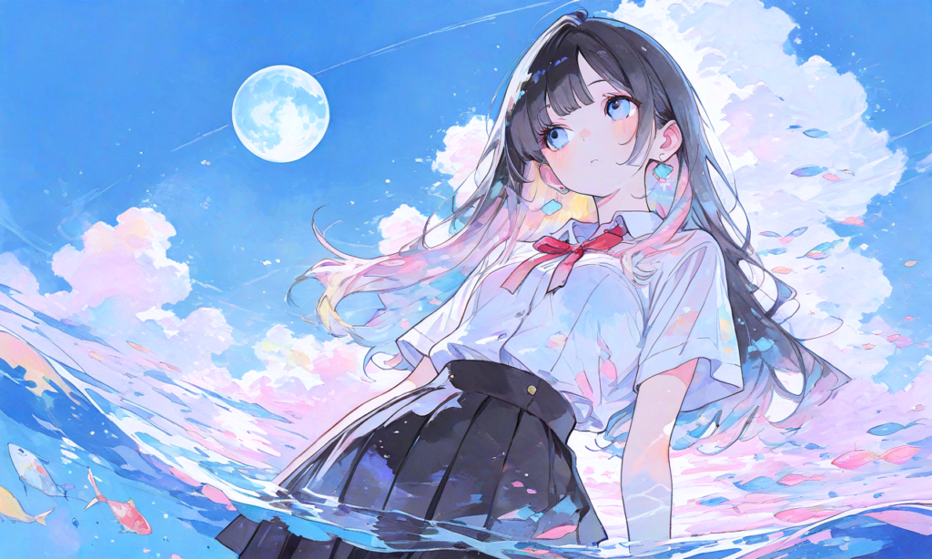 PixAI【Shiitake-Mix】impasto, giant moon on the horizon,oil painting texture,1girl,black hair, long hair, blue eyes, white dress shirt, short sleeves, black skirt, school uniform, red neckribbon, pleated skirt, small breasts,cowboy shot,looking away, partially submerged, ((((Fish swimming in the sky)))),from below, watercolor, sketch style, watercolor effect, pastel colors,((4k,8k,Ultra HD)),((Masterpiece :1.2)),((Best quality :1.2)),((Detailed :1.5)),((Detailed background :1.5)),high-res,♡masterpiece, highest quality, ♡,watercolor, sketch style, watercolor effect, pastel colors