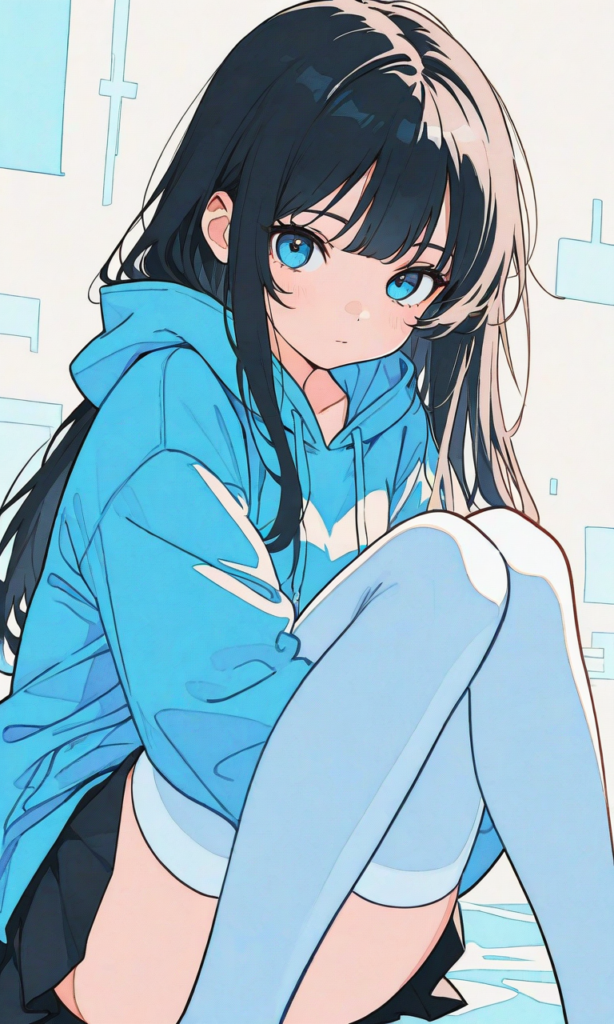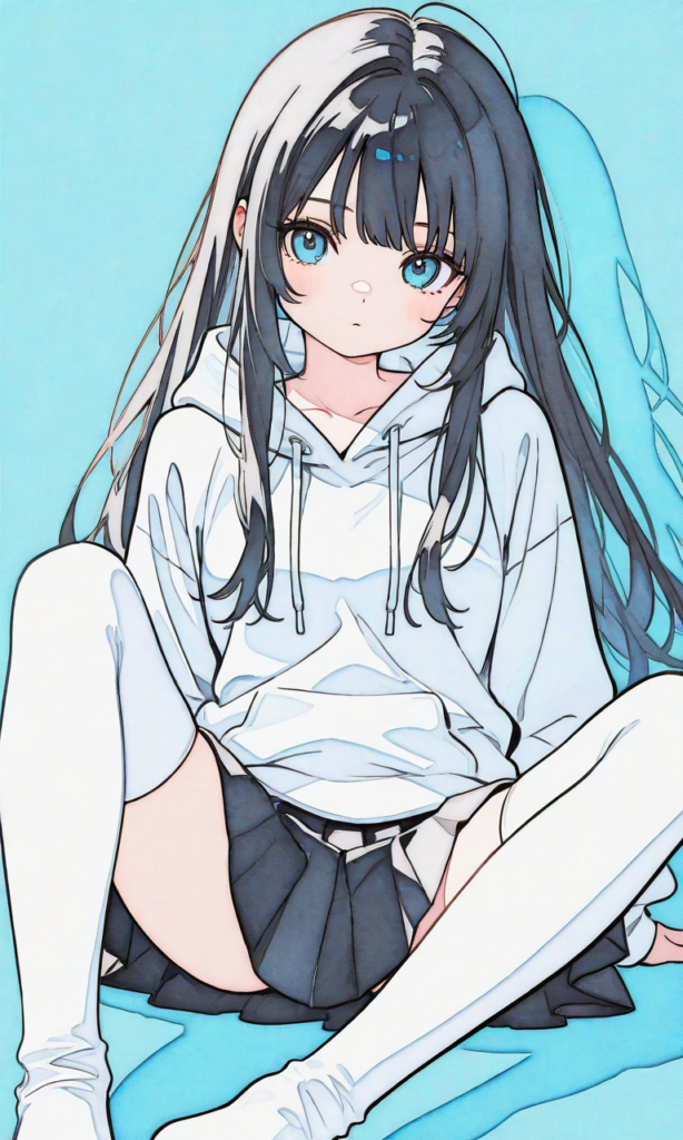 PixAI【Shiitake-Mix】((vector art)), flat color, cel shading, flat lighting, ((muted color)), 1girl, black hair, long hair, blue eyes, black skirt, pleated skirt, small breasts, wearing oversized hoodie, no lineart hoodie, white thighhighs, knees up, high-res, ((sketch-like outlines, watercolor coloring, watercolor texture, japanese style, best quality, ultra detailed, lineart-heavy style, sketch style))