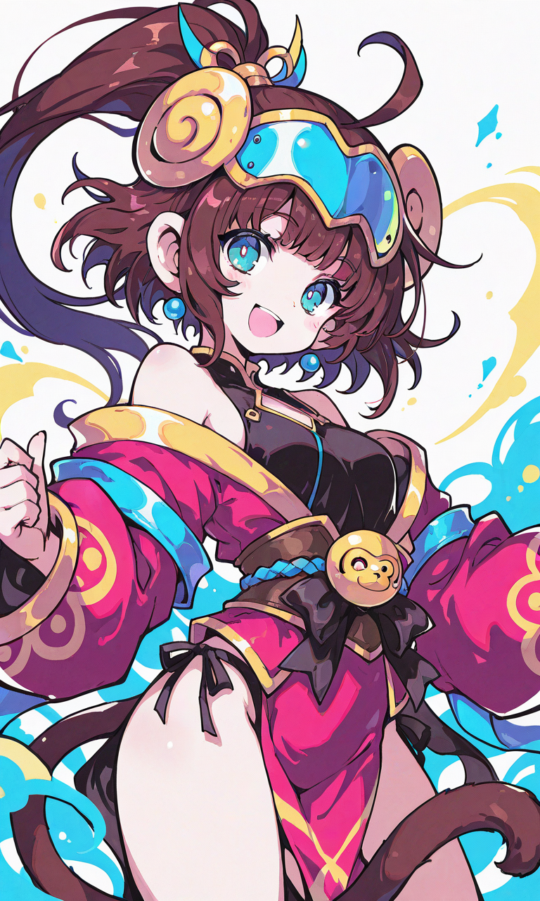 PixAI【Shiitake-Mix】monkey(animal),solo, smile,open mouth, cowboy shot,simplebackground,white background, masterpiece,high quality, high resolution,neon pop art style,tokiame, Fantasy Scene,
