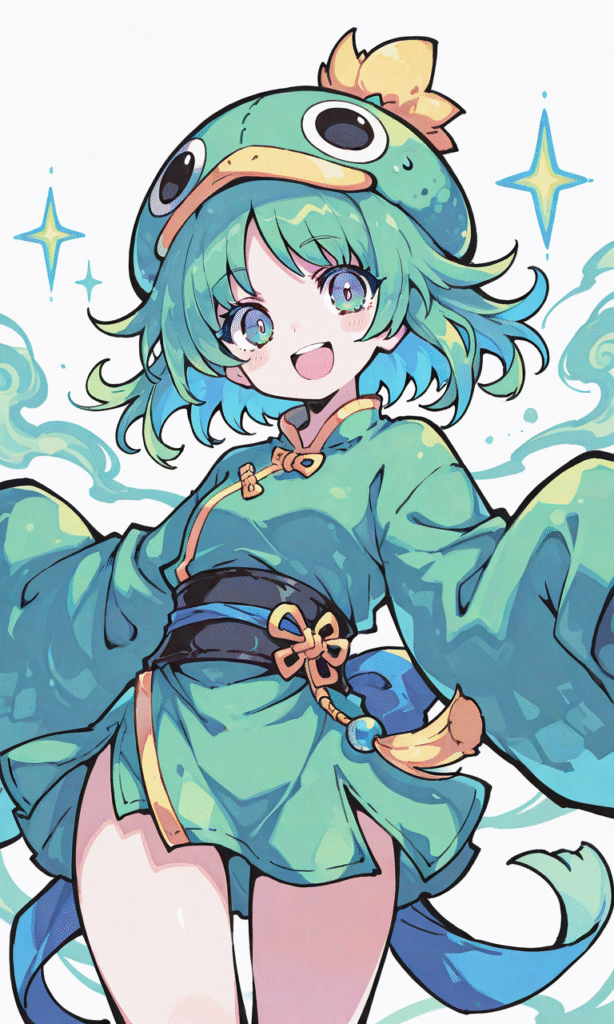 Kappa,solo,china style, smile,open mouth, cowboy shot,simplebackground,white background, masterpiece,high quality, high resolution,neon pop art style,tokiame, Fantasy Scene,