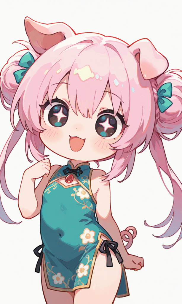 pig girl, solo,china dress,smile,open mouth, cowboy shot,simplebackground,white background, masterpiece,high quality, high resolution, Fantasy Scene,tokiame, Fantasy Scene, ,chibi, big_head, small_body, large_eyes, blush, simple_lines, bright_colors, simple_colors, cute
