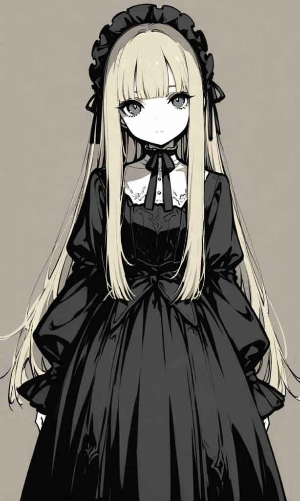 baroque(style),little girl,blonde hair, long hair, straight hair, blunt bangs,black dress, white color, long skirt,looking at viewer, Gothic Lolita,looking at viewer, cowboy shot,((simple background)),minimalism, masterpiece,high resolution,high quality, ,high-res,monochrome, v2.0