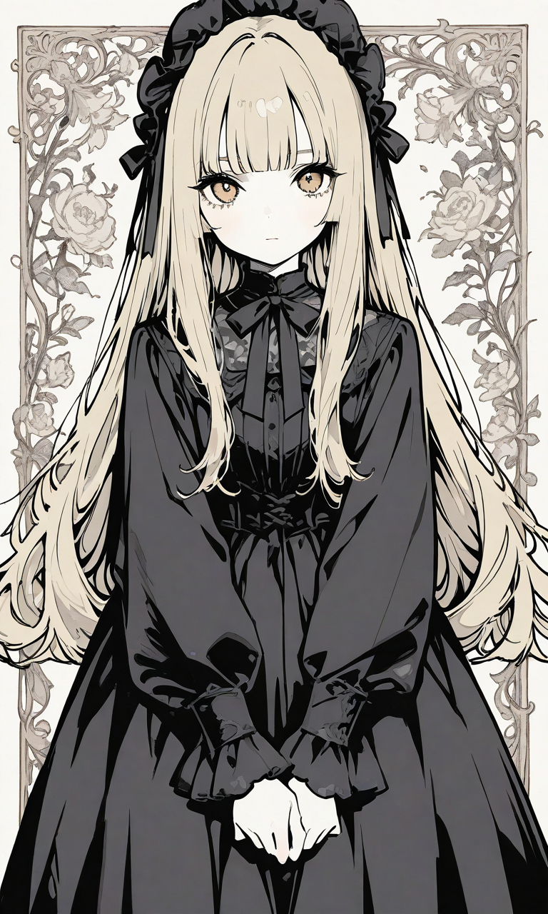 PixAI【Shiitake-Mix】baroque(style),little girl,blonde hair, long hair, straight hair, blunt bangs,black dress, ((white color)),neck ribbon, long skirt,looking at viewer,v arms, Gothic Lolita,looking at viewer, cowboy shot,simple background, minimalism, masterpiece,high resolution,high quality, ,high-res,monochrome, v2.0,(watercolor_(medium):1.2)(simple coloring,flat color:2)dutch angle