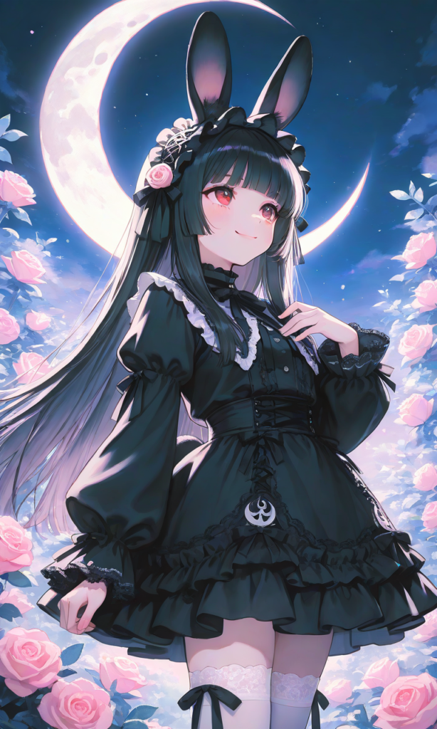 PixAI【Shiitake-Mix】little girl,black hair, long hair, straight hair, blunt bangs, red eyes, rabbit ears, smile, Gothic Lolita,black dress, white frill, ,miniskirt, lace black thighhighs,cowboy shot,Pink Rose Garden,crescent moon, night sky,Soft moonlight, masterpiece,high resolution,high quality, ,high-res,illustration, draw style, semi-realistic, soft lighting, pastel colors, glow effect, delicate shading, saturated colors ,clndl_style,Yuzukastyle, pastel colors,
