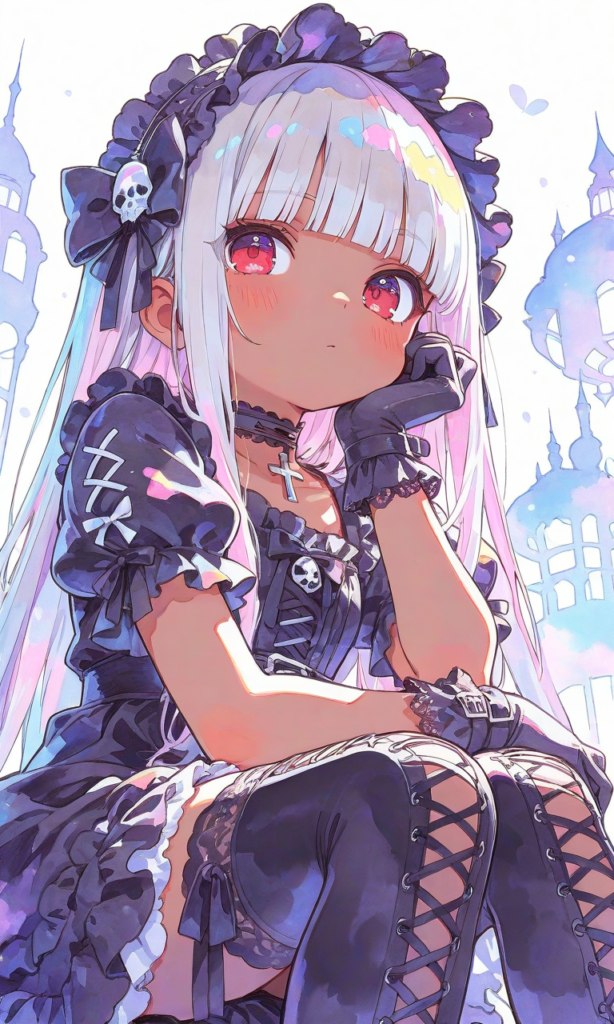 PixAI【Shiitake-Mix】little girl,loli,dark skin, silver hair, long hair, straight hair, blunt bangs,red eyes, Gothic Lolita,puffy short sleeves, purple lace-trimmed,laced gloves, cross-laced choker, bow hairband,laced thighhighs,sitting,invisible chair,head rest, cowboy shot,from below, masterpiece,high resolution,high quality, ,high-res,watercolor, sketch style, watercolor effect, pastel colors