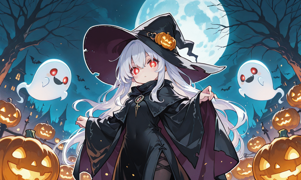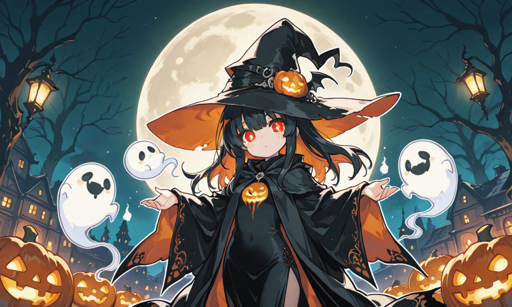 PixAI【Shiitake-Mix】jack-o’-lantern print moon, big moon, moon focus, ghost, dancing, from below, witch, black cloak, cowboy shot, night sky, halloween party, masterpiece, spooky atmosphere, glowing eyes, floating, supernatural, festive, high resolution, high quality, tokiame, ((4k,8k,Ultra HD)), ((Masterpiece :1.2)), ((Best quality :1.2)), ((Detailed :1.5)), ((Detailed background :1.5)), Fantasy Scene, Chibi, white outline