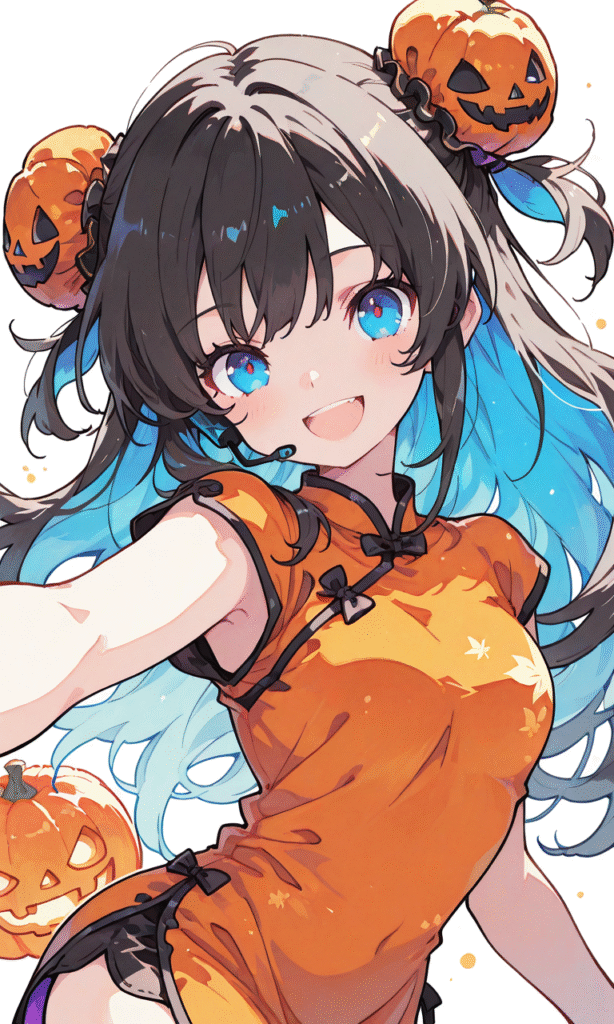 Halloween,orange china dress,maple stamp,black hair, double bun, hair cover(Jack-o’-lantern),headset, looking at viewer, smile,open mouth, cowboy shot,simplebackground,white background, masterpiece,high quality, high resolution,tokiame, Flatline, Flat vector illustration, Vivid colors, white thick outline, outline, Blue Inner hair color, watercolor, soft light, ,hyper-detailed, high contrast, depth of field, ray tracing, best lighting, cinematic composition, beautiful face, beautiful eyes, sharp focus, (masterpiece:1.2), (best quality:1.2), (very aesthetic:1.2), (absurdres:1.2), (detailed background),