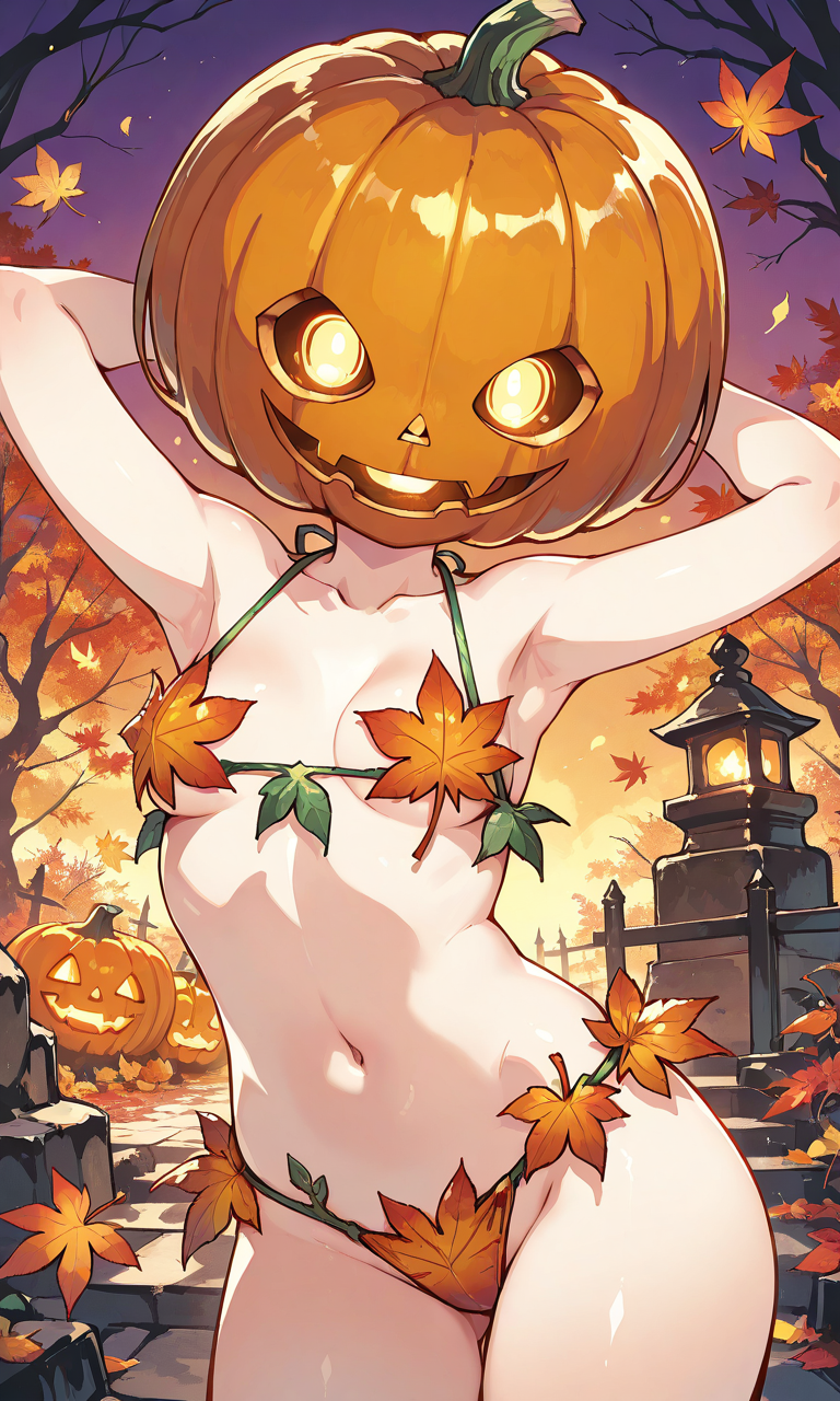 Jack-o’-lantern,pumpkin head girl,maple bikini,leaf bikini,looking at viewer,Sexy pose, cowboy shot, masterpiece,high quality,high resolution , Fantasy Scene,tokiame, Fantasy Scene,