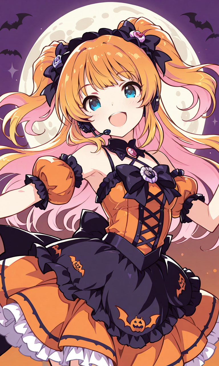 PixAI【Shiitake-Mix】girl,Halloween gothic lolita,orange dress, halloween, smile,open mouth,headset, cute & girly (idolmaster),dancing, cowboy shot,moon night, masterpiece,high quality, high resolution,tokiame,Kawaii Precious XL