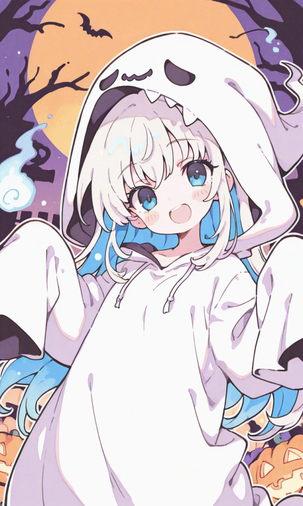 little girl,ghost kigurumi,long clothes, smile,open mouth, cowboy shot,halloween, night,masterpiece,high quality, high resolution,tokiame,Anime, moe, Flatline, Flat vector illustration, Vivid colors, white thick outline, outline, Blue Inner hair color, watercolor, soft light, ,neon pop art style
