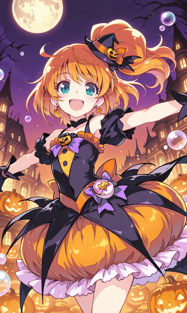 precure,cure Halloween,frilled dress,bubble skirt, orange hair, side ponytail, small hat,smile,open mouth,cute & girly (idolmaster),spread arms, cowboy shot,Halloween night, masterpiece,high quality, high resolution,tokiame, Fantasy Scene,