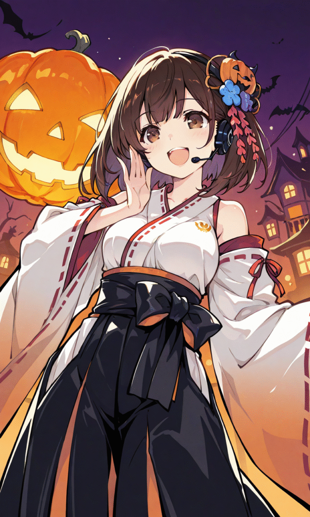PixAI【Shiitake-Mix】orange miko,black hakama, halloween costume,no hat,Halloween kanzashi, headset, smile,open mouth,Halloween night,singing,cowboy shot, masterpiece,high quality, high resolution,tokiame,Aegyo sal, masterpiece,