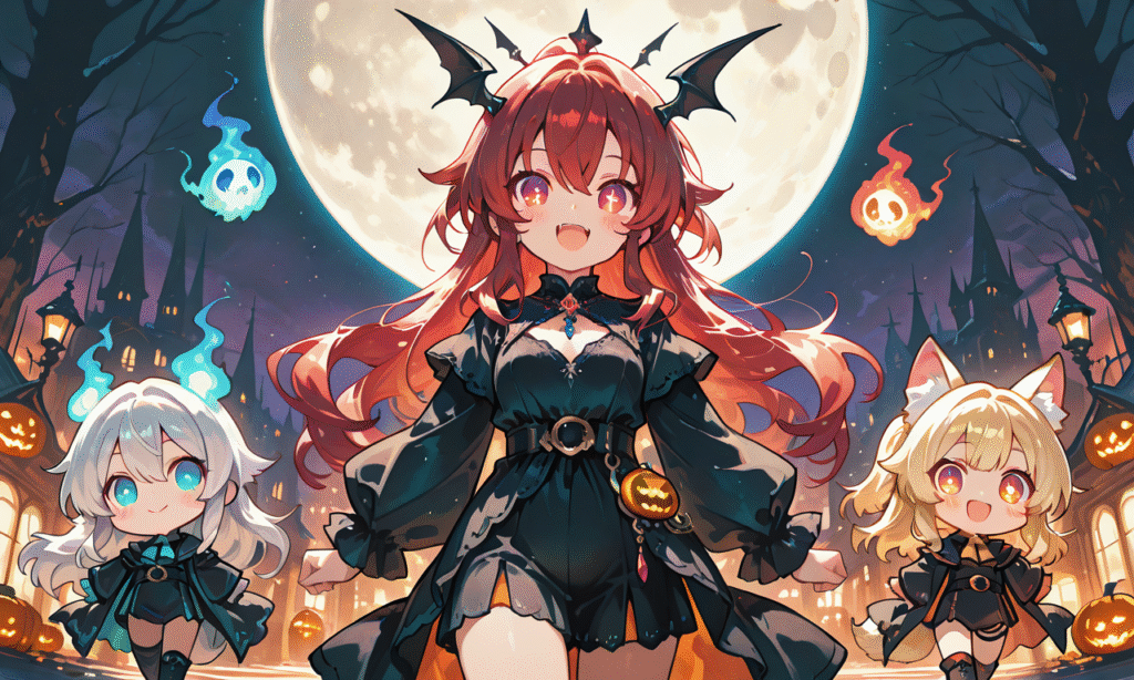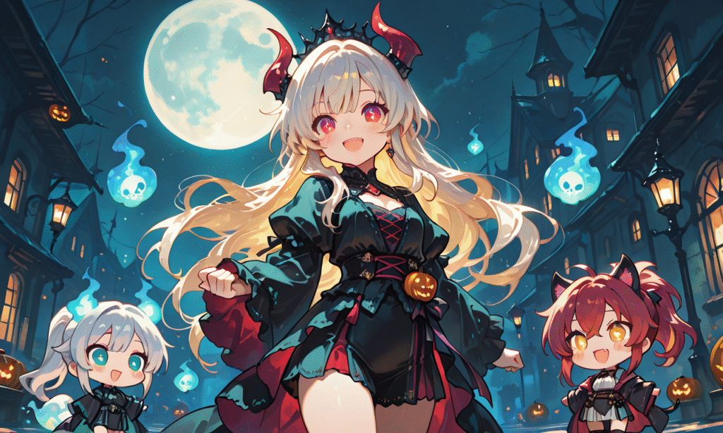 3girls, halloween costume(blonde hair, red hair, silver hair),will-o’-the-wisp,walking,paradeus, moon night,smile,open mouth, cowboy shot,masterpiece,high quality, high resolution,chibi, big_head, small_body, large_eyes, blush, simple_lines, bright_colors, simple_colors, cute,tokiame, Fantasy Scene, ,hyper-detailed, high contrast, depth of field, ray tracing, best lighting, cinematic composition, beautiful face, beautiful eyes, sharp focus, (masterpiece:1.2), (best quality:1.2), (very aesthetic:1.2), (absurdres:1.2), (detailed background),