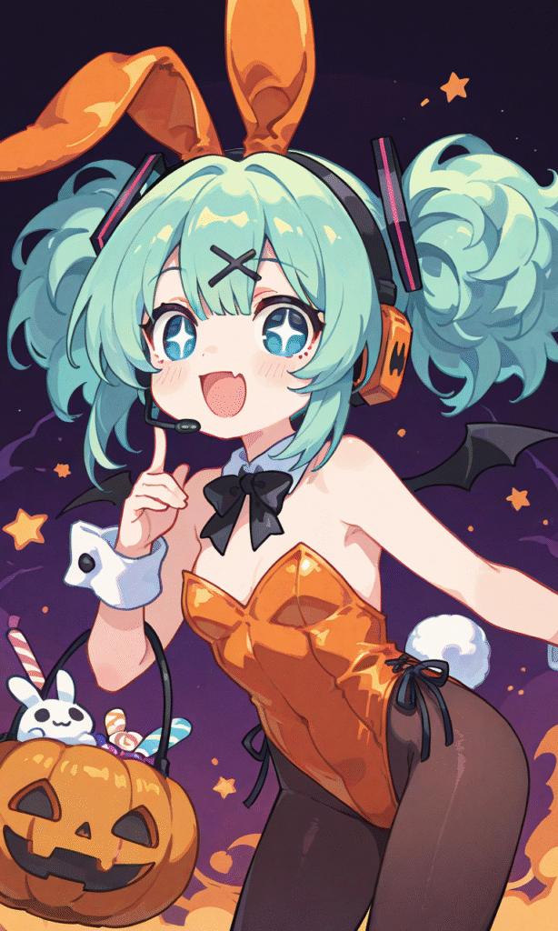 1girl,((solo)),halloween bunnygirl,orange bunnygirl,pantyhose, smile,open mouth,headset, singing,cowboy shot,Halloween night,looking at viewer, masterpiece,high quality, high resolution ,tokiame,chibi, big_head, small_body, large_eyes, blush, simple_lines, bright_colors, simple_colors, cute