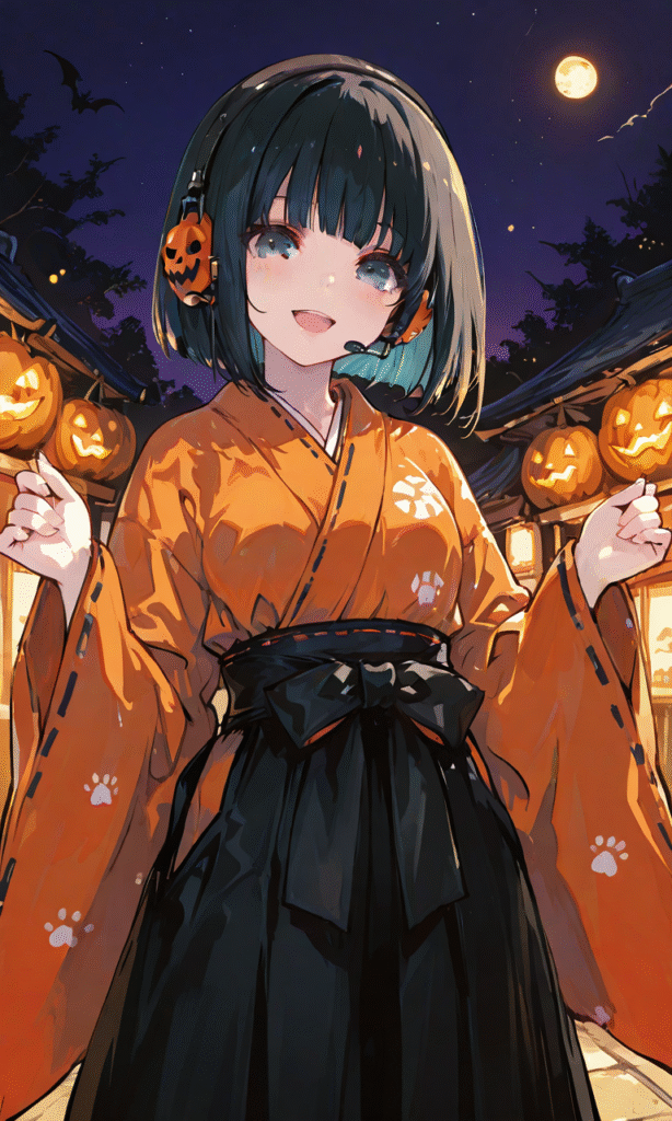 halloween miko,orange kimono,black hakama,headset,bob cut, black hair, smile, open mouth, looking at viewer,cowboy shot,night sky, masterpiece,high quality, high resolution,tokiamehalloween miko,orange kimono,black hakama,headset,bob cut, black hair, smile, open mouth, looking at viewer,cowboy shot,night sky, masterpiece,high quality, high resolution,tokiame