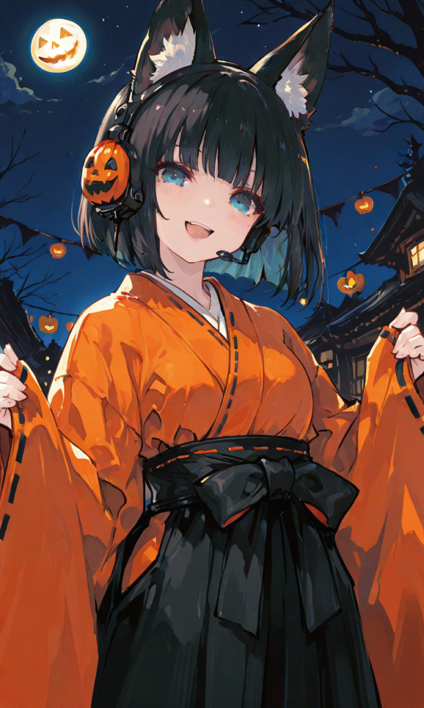 halloween miko,orange kimono,black hakama,headset,bob cut, black hair,fox ears, smile, open mouth, looking at viewer,cowboy shot,night sky, masterpiece,high quality, high resolution,tokiamehalloween miko,orange kimono,black hakama,headset,bob cut, black hair,fox ears, smile, open mouth, looking at viewer,cowboy shot,night sky, masterpiece,high quality, high resolution,tokiame