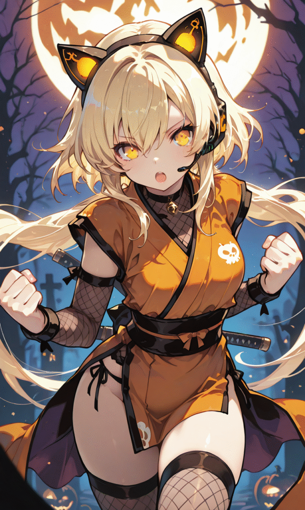 girl,orange ninja,blonde hair, headset,fighting stance, open mouth,fishnet thighhighs, cowboy shot,Halloween night, masterpiece,high quality, high resolution,tokiame,hyper-detailed, high contrast, depth of field, ray tracing, best lighting, cinematic composition, beautiful face, beautiful eyes, sharp focus, (masterpiece:1.2), (best quality:1.2), (very aesthetic:1.2), (absurdres:1.2), (detailed background),girl,orange ninja,blonde hair, headset,fighting stance, open mouth,fishnet thighhighs, cowboy shot,Halloween night, masterpiece,high quality, high resolution,tokiame,hyper-detailed, high contrast, depth of field, ray tracing, best lighting, cinematic composition, beautiful face, beautiful eyes, sharp focus, (masterpiece:1.2), (best quality:1.2), (very aesthetic:1.2), (absurdres:1.2), (detailed background),